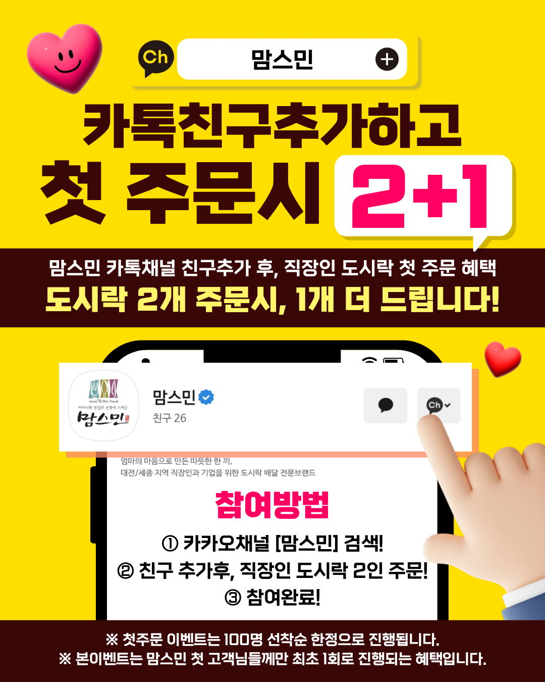 카톡 친구 추가 한 번이면 도시락 2+1 혜택이 쏟아집니다.